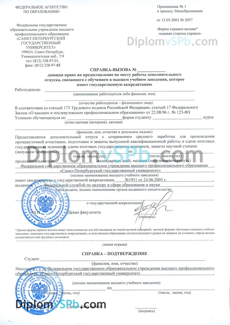 Обращайтесь! Для оформления справки-вызова свяжитесь с нами удобным для Вас способом: по телефону в Санкт-Петербурге 8 (981) 281-09-02, е-мейл mail@diplomvspb.ru, или оформив онлайн заказ по кнопке внизу. Доставка по Санкт-Петербургу осуществляется бесплатно и без предоплаты в короткие сроки.